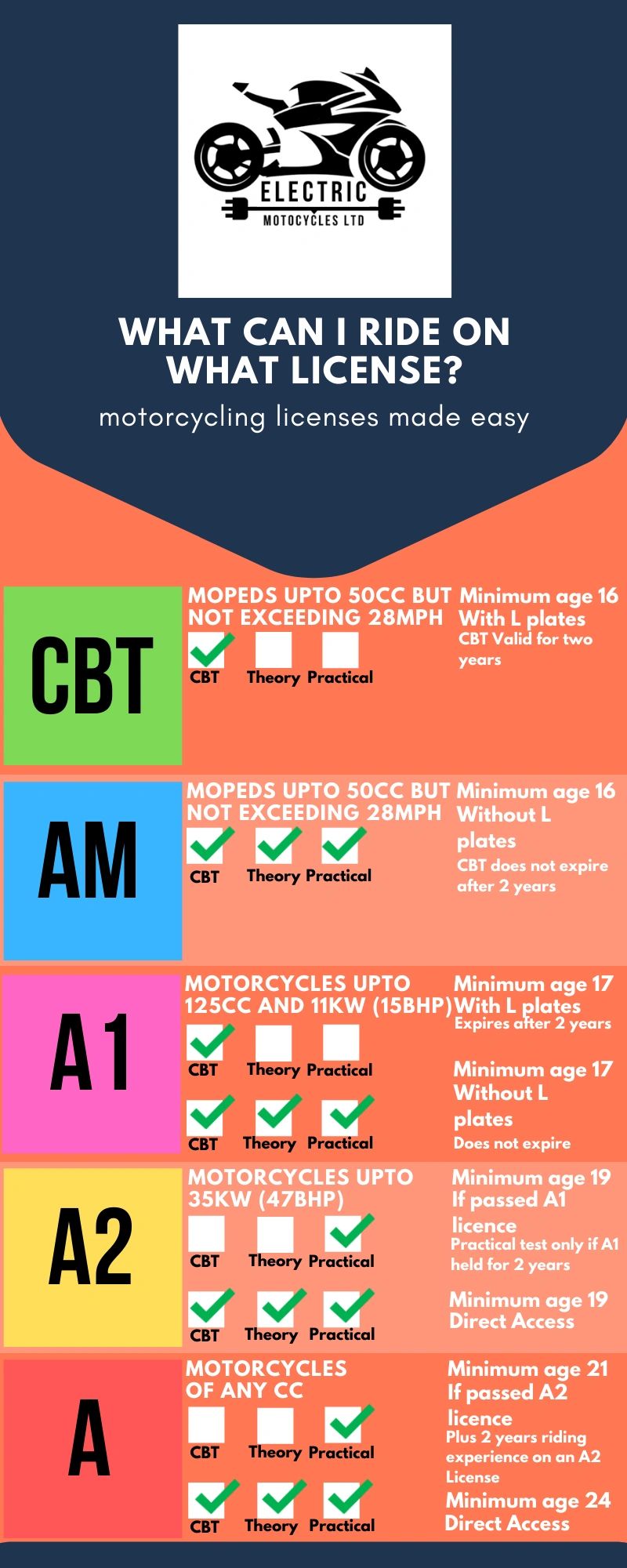Electric motorcycles and mopeds that are restricted to 28mph can be ridden with a CBT licence, a full Motorcycle licence or a full car driving licence if you passed before February 1st 2001.